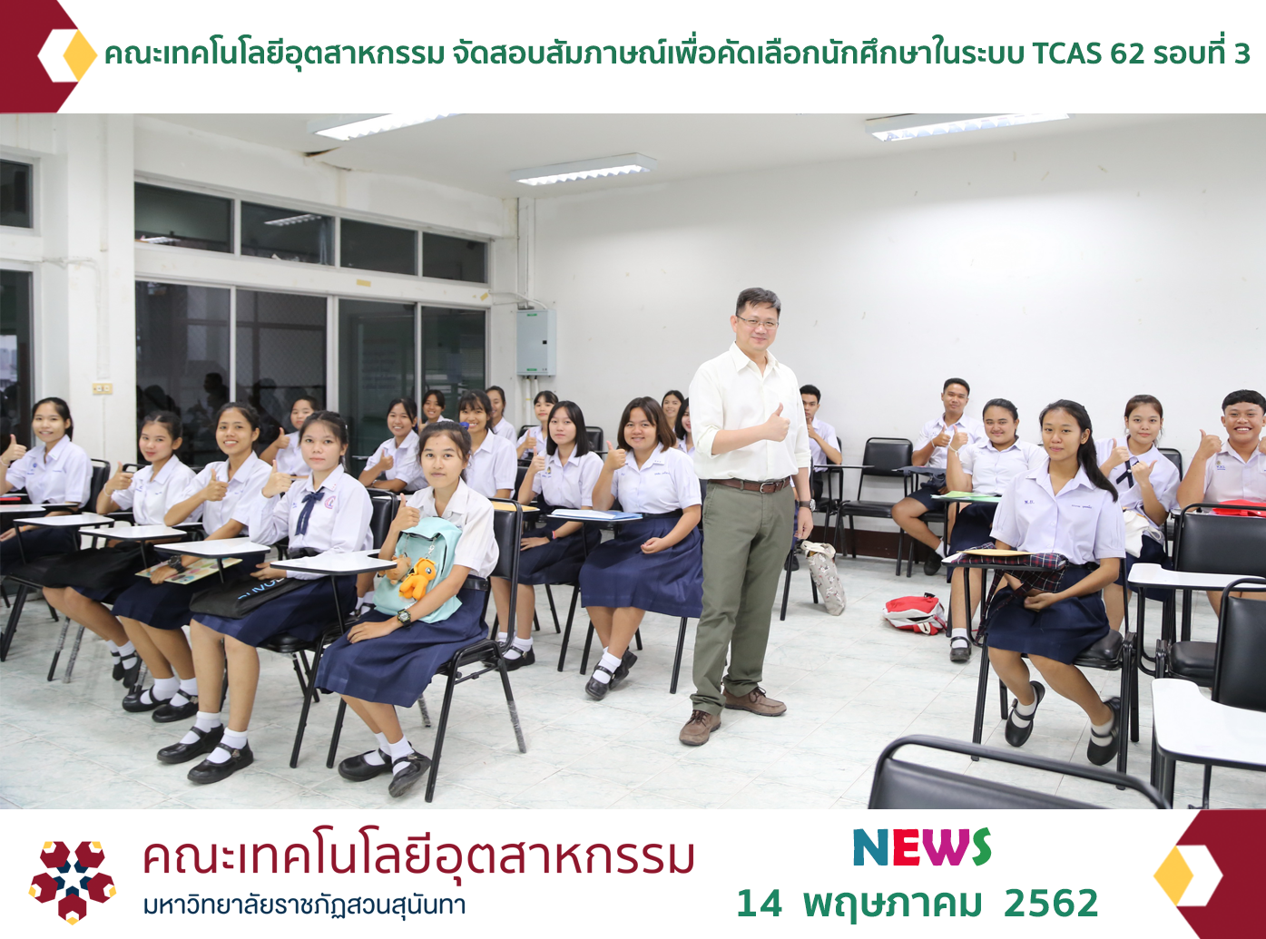 วันนี้ (14 พ.ค. 62) ณ อาคาร 42 และ อาคาร 47 คณะเทคโนโลยีอุตสาหกรรม ผู้ช่วยศาสตราจารย์ ดร.พลัง วงษ์ธนสุภรณ์ คณบดีคณะเทคโนโลยีอุตสาหกรรม ได้ตรวจเยี่ยมการสอบสัมภาษณ์นักศึกษาเพื่อคัดเลือกนักศึกษาเข้าศึกษาต่อในคณะเทคโนโลยีอุตสาหกรรม ตามกำหนดการปฏิทินการรับสมัครในระบบ TCAS 62 ประจำปี 2562 รอบที่ 3 รับตรงร่วมกัน ทั้งนี้จะสรุปผล และประกาศรายชื่อผู้ผ่านการสอบสัมภาษณ์ ในวันศุกร์ที่ 17 พฤษภาคม 2562 ทางเว็บไซต์มหาวิทยาลัยราชภัฏสวนสุนันทา http://admission.ssru.ac.th