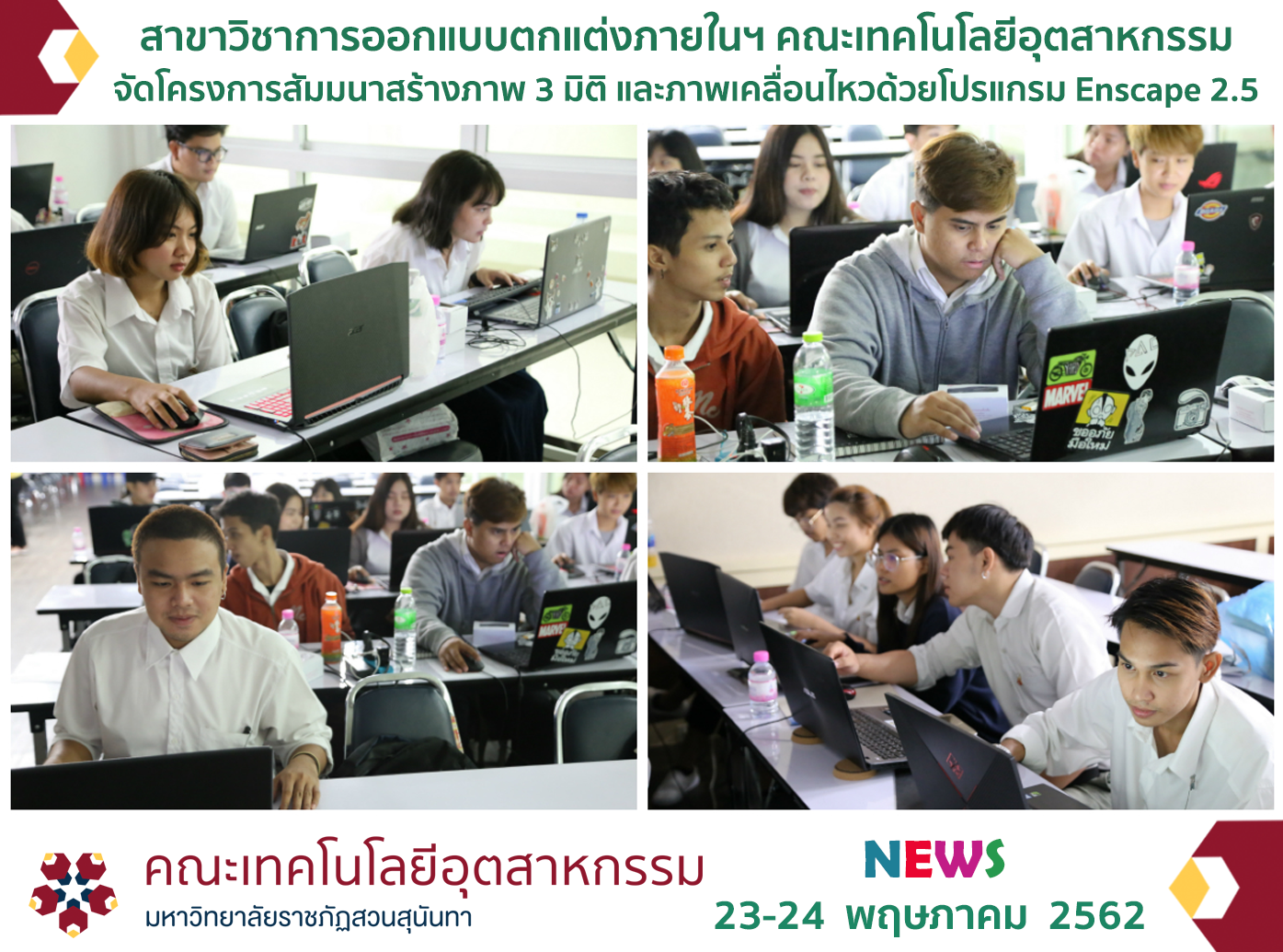 เมื่อวันที่ 23 – 24 พฤษภาคม 2562 ณ ห้อง 4701 อาคาร 47 สาขาวิชาการออกแบบตกแต่งภายในและนิทรรศการ คณะเทคโนโลยีอุตสาหกรรม จัดโครงการสัมมนาเชิงปฏิบัติการสร้างภาพ 3 มิติ และภาพเคลื่อนไหวด้วยโปรแกรม Enscape 2.5 โดยวิทยากรบรรยาย คุณสมยศ ชัยเจริญ จากบริษัท สเกตอัพฟาสต์ จำกัด ผู้เชี่ยวชาญด้านโปรแกรม Sketch up และ Enscape ซึ่งมีนักศึกษาเข้าร่วมโครงการสัมมนาฯ จำนวน 40 คน โครงการดังกล่าวจัดขึ้นเพื่อให้นักศึกษามีความรู้และสามารถใช้โปรแกรมเพื่อสร้างงานออกแบบได้อย่างมีประสิทธิภาพและทำงานอย่างเต็มศักยภาพ (Active Brain)