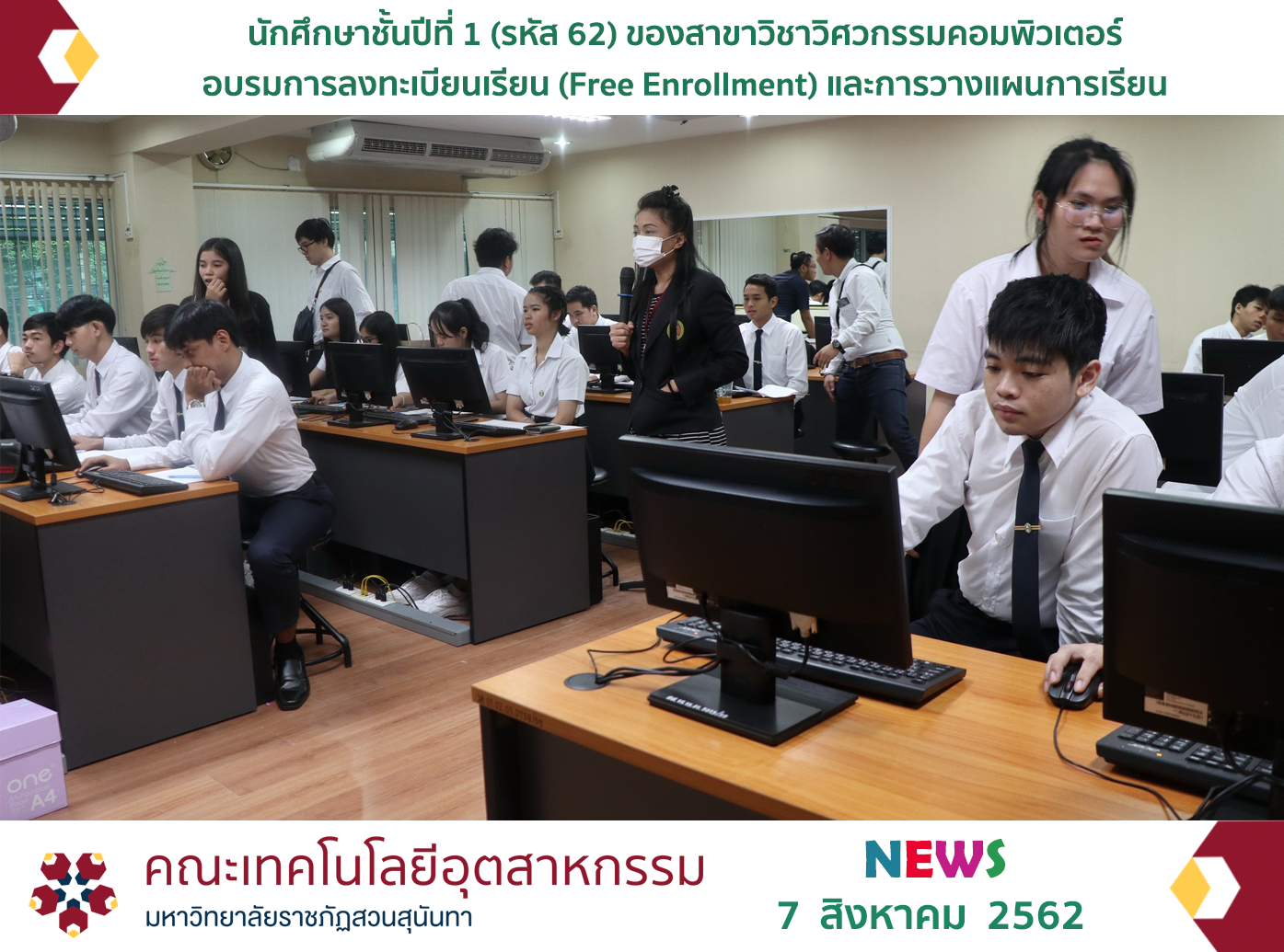 วันที่ 7 สิงหาคม 2562 ฝ่ายบริการการศึกษา คณะเทคโนโลยีอุตสาหกรรม จัดอบรมการลงทะเบียนเรียน (Free Enrollment) และการวางแผนการเรียนสำหรับนักศึกษาชั้นปีที่ 1 (รหัส 62) ของสาขาวิชาวิศวกรรมคอมพิวเตอร์ ณ ห้อง 4222 อาคาร 42 คณะเทคโนโลยีอุตสาหกรรม