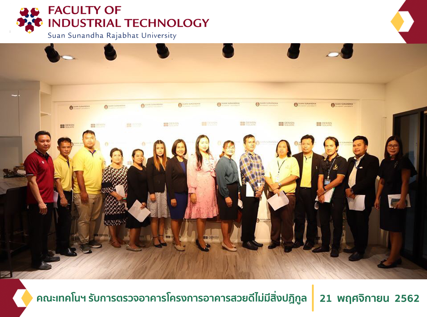 เมื่อวันที่ 21 พฤศจิกายน 2562 นางสาวชญาภา แจ่มใส หัวหน้าสำนักงานคณบดี พร้อมด้วยนายชีวิน ชินดิลกวณิช ผู้รับผิดชอบงานอาคารและสถานที่คณะเทคโนโลยีอุตสาหกรรม ให้การต้อนรับคณะกรรมการตรวจประเมินอาคารสวยดีไม่มีสิ่งปฏิกูล ณ อาคาร 42 อาคาร 43 และอาคาร 47