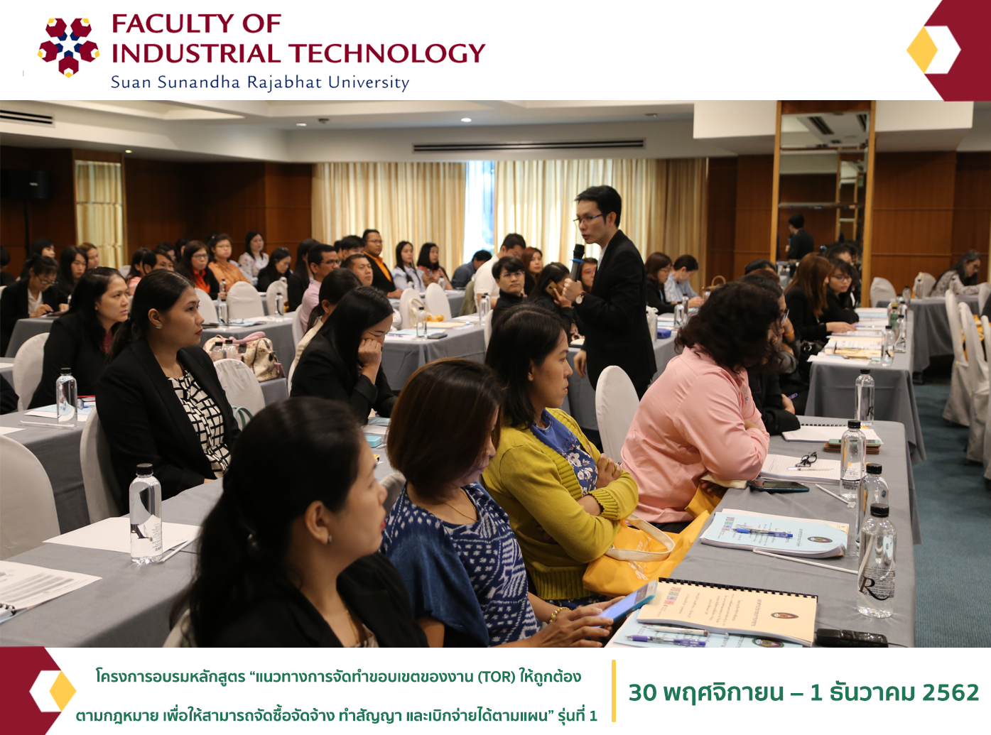 คณะเทคโนโลยีอุตสาหกรรม มหาวิทยาลัยราชภัฏสวนสุนันทา จัดโครงการอบรมหลักสูตร “แนวทางการจัดทำขอบเขตของงาน (TOR) ให้ถูกต้องตามกฎหมาย เพื่อให้สามารถจัดซื้อจัดจ้าง ทำสัญญา และเบิกจ่ายได้ตามแผน” รุ่นที่ 1 ในวันที่ 30 พฤศจิกายน – 1 ธันวาคม 2562 ณ โรงแรมรอยัลริเวอร์ กรุงเทพฯ โดยมี อาจารย์พิชา ศรีพระจันทร์ รองคณบดีฝ่ายบริหาร คณะเทคโนโลยีอุตสาหกรรม มหาวิทยาลัยราชภัฏสวนสุนันทา เป็นประธานกล่าวเปิดการอบรม โดยได้รับเกียรติจาก อาจารย์ณัฐชนน ศิริพงษ์สุรภา วิทยากรบรรยาย การอบรมดังกล่าวมีวัตถุประสงค์เพื่อให้ผู้เข้าอบรมมีความรู้ ความเข้าใจด้านกฎหมาย ระเบียบ ข้อบังคับ และแนวทางปฏิบัติที่เกี่ยวกับการจัดซื้อจัดจ้างและการบริหารพัสดุภาครัฐ ความรู้ทั่วไปและการบริหารงานด้านการเงินการคลังในภาครัฐ รวมถึงการปฏิบัติงานในระบบอิเล็กทรอนิกส์