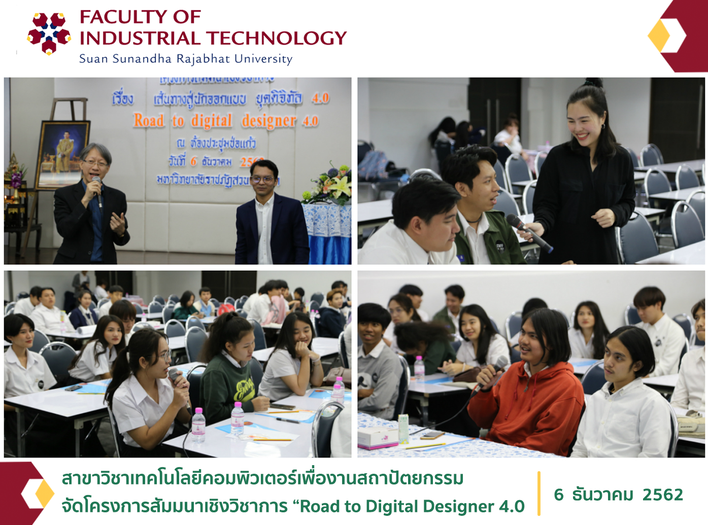เมื่อวันที่ 6 ธันวาคม 2562 ณ ห้องประชุมช่อแก้ว สาขาวิชาเทคโนโลยีคอมพิวเตอร์เพื่องานสถาปัตยกรรม คณะเทคโนโลยีอุตสาหกรรม จัดโครงการสัมมนาเชิงวิชาการ “Road to Digital Designer 4.0 ให้กับนักศึกษาชั้นปีที่ 1 – 4 ในสาขาวิชาเทคโนโลยีคอมพิวเตอร์เพื่องานสถาปัตยกรรม โดยมีวัตถุประสงค์เพื่อเป็นการเพิ่มทักษะในการทำงานด้านวิชาชีพ Digital Designer และเพื่อสร้างแนวความคิดในการออกแบบสื่อยุคใหม่ให้ตรงตามความต้องการของกลุ่มเป้าหมาย โดยได้รับเกียรติจากวิทยากร คุณวิรชัช ขจิตวรพันธ์ ตำแหน่ง User experience designer : Builk One Group, คุณณิชารีย์ พงษ์สมบูรณ์ ตำแหน่ง Co-Founder & Business Development : YAAF Design และคุณณัฐวิดล มหาจันทร ตำแหน่ง BIM Manager : YAAF Design