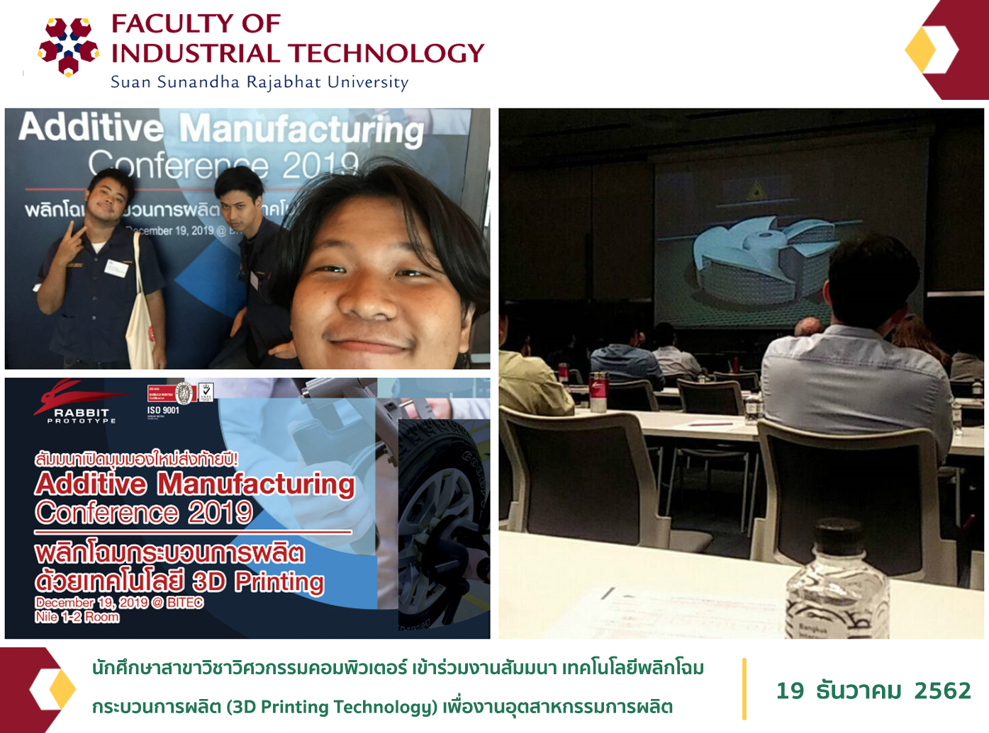 วันที่ 19 ธันวาคม 2019 ณ ไบเทคบางนา นายสุรชัย จำปาทอง นายพรพิพัฒน์ ฝ่ายกลาง และนายวีรภัทร ชัยรัตน์เมธี นักศึกษาสาขาวิชาวิศวกรรมคอมพิวเตอร์ เข้าร่วมงานสัมมนา Additive Manufacturing เทคโนโลยีพลิกโฉมกระบวนการผลิต(3D Printing Technology) เพื่องานอุตสาหกรรมการผลิต (Additive Manufacturing Conference 2019)