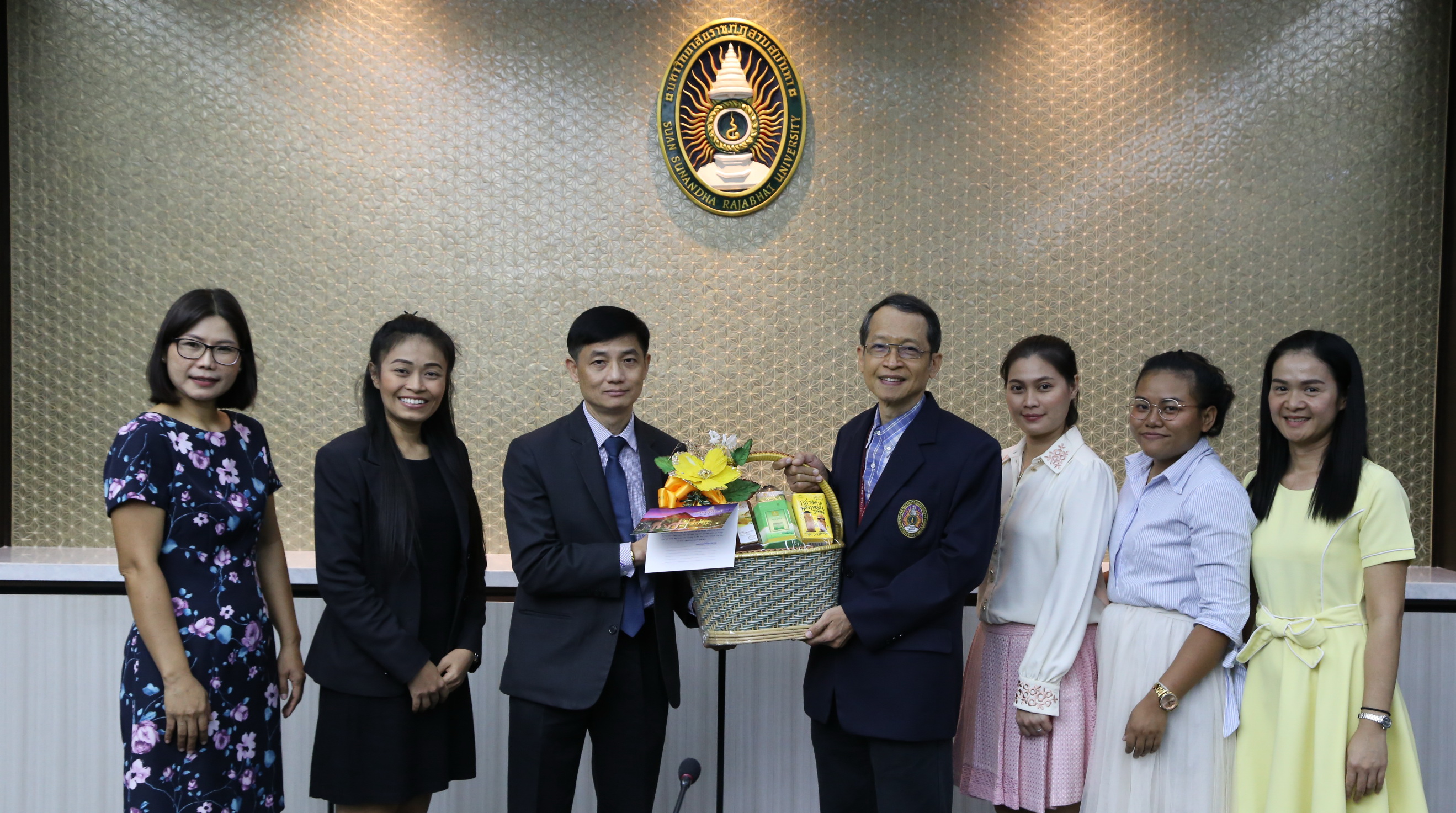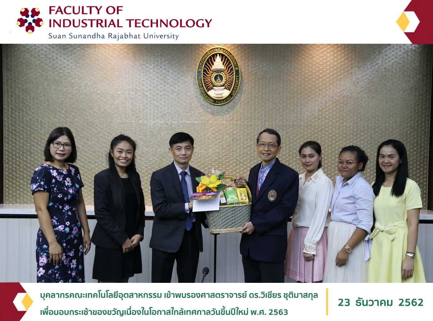 23 ธันวาคม 2562 คณะเทคโนโลยีอุตสาหกรรม นำโดยผู้ช่วยศาสตราจารย์ ดร.อธิสมัย โสพันธ์ รักษาราชการแทนคณบดีคณะเทคโนโลยีอุตสาหกรรม พร้อมด้วย นางสาวชญาภา แจ่มใส หัวหน้าสำนักงานคณบดี และบุคลากรของคณะฯ เข้าพบรองศาสตราจารย์ ดร.วิเชียร ชุติมาสกุล เพื่อมอบกระเช้าของขวัญเนื่องในโอกาสใกล้เทศกาลวันขึ้นปีใหม่ พ.ศ. 2563 ณ ห้องประชุมสภามหาวิทยาลัยราชภัฏสวนสุนันทา