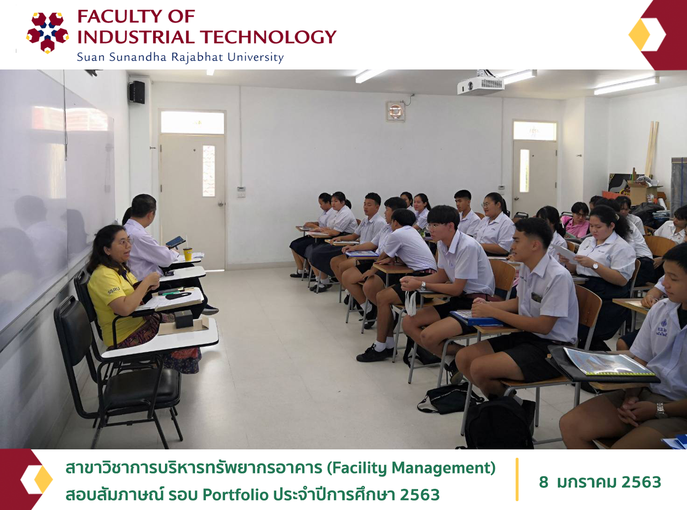 8 มกราคม 2563 สาขาวิชาการบริหารทรัพยากรอาคาร (Facility Management) คณะเทคโนโลยีอุตสาหกรรม ดำเนินการจัดสอบสัมภาษณ์เพื่อคัดเลือกบุคคลเข้าศึกษาต่อในระดับปริญญาตรี ภาคปกติ รอบ Portfolio ประจำปีการศึกษา 2563 ณ อาคารคณะเทคโนโลยีอุตสาหกรรม มหาวิทยาลัยราชภัฏสวนสุนันทา