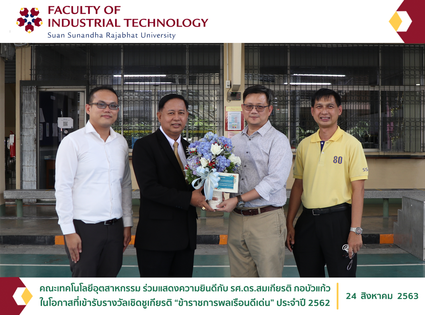วันที่ 24 สิงหาคม 2563 คณะเทคโนโลยีอุตสาหกรรม นำโดย ผู้ช่วยศาสตราจารย์ ดร.พลัง วงษ์ธนสุภรณ์ คณบดี พร้อมด้วย อาจารย์ ดร.ชนมภัทร โตระสะ รองคณบดีฝ่ายวิชาการ และผู้ช่วยศาสตราจารย์ ดร.พรภวิษย์ บุญศรีเมือง รองคณบดีฝ่ายแผนงานและประกันคุณภาพ ร่วมแสดงความยินดีกับรองศาสตราจารย์ ดร.สมเกียรติ กอบัวแก้ว ในโอกาสที่เข้ารับรางวัลเข็มครุฑทองคำพร้อมเกียรติบัตรเชิดชูเกียรติ ข้าราชการพลเรือนดีเด่น ประจำปี 2562