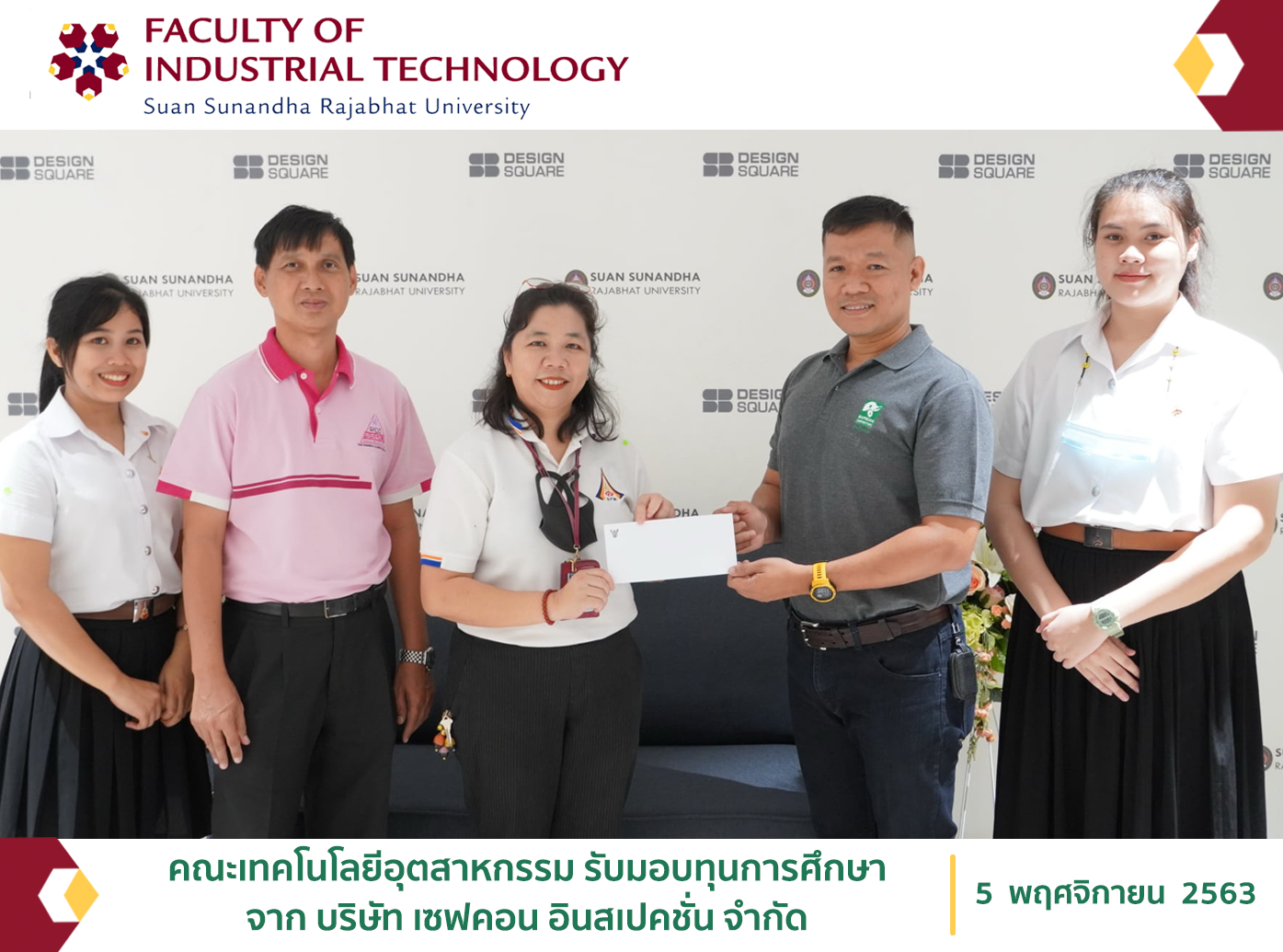 คณะเทคโนโลยีอุตสาหกรรม โดย ผู้ช่วยศาสตราจารย์ ดร.ชนมภัทร โตระสะ รองคณบดีฝ่ายวิชาการ และผู้ช่วยศาสตราจารย์จิตราวดี รุ่งอินทร์ กันกา หัวหน้าสาขาวิชาการบริหารทรัพยากรอาคาร รับมอบทุนการศึกษาจาก บริษัท เซฟคอน อินสเปคชั่น จำกัด โดยมีคุณสงกรานต์ เม่นทอง กรรมการผู้จัดการ เป็นผู้มอบทุนการศึกษา จำนวน 1 ทุน ทุนละ 5,000 บาท เพื่อช่วยเหลือนักศึกษาที่เรียนดีแต่ขาดแคลนทุนทรัพย์ในรอบการสมัคร Portfolio ประจำปีการศึกษา 2564