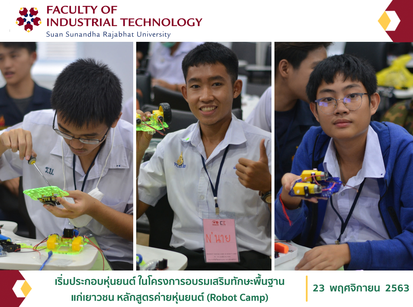 วันที่ 23 พฤศจิกายน 2563 ช่วงบ่าย เริ่มประกอบหุ่นยนต์ ในโครงการอบรมเสริมทักษะพื้นฐานแก่เยาวชน หลักสูตรค่ายหุ่นยนต์ (Robot Camp) จัดโดยสาขาวิชาวิศวกรรมคอมพิวเตอร์ ณ ห้อง Smart Classroom คณะเทคโนโลยีอุตสาหกรรม มหาวิทยาลัยราชภัฏสวนสุนันทา