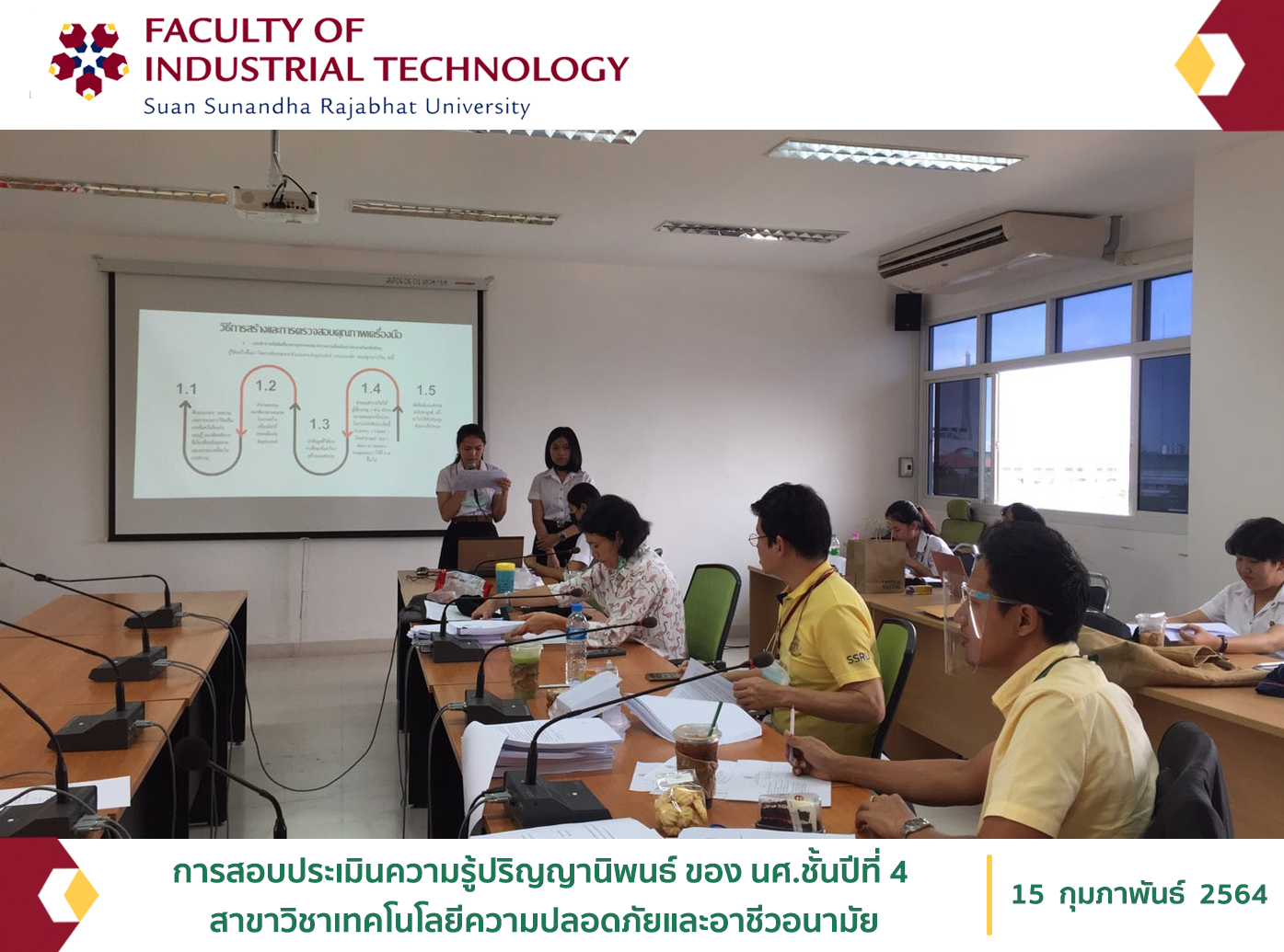 วันที่ 4,8 กุมภาพันธ์ 2564 ได้มีการสอบประเมินความรู้ปริญญานิพนธ์ ของ นศ.ชั้นปีที่ 4 สาขาวิชาเทคโนโลยีความปลอดภัยและอาชีวอนามัย ก่อนการอนุมัติให้สำเร็จการศึกษาในขั้นตอนต่อไป แม้จะมีอุปสรรคในการเก็บข้อมูลด้วยสถาการณ์โรคระบาด COVID-19 แต่ทุกคนก็ตั้งใจอย่างเต็มกำลัง