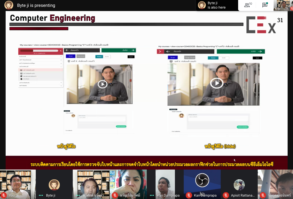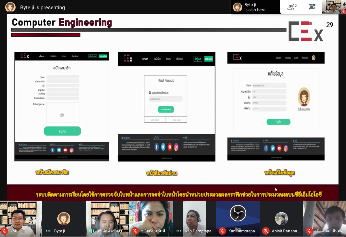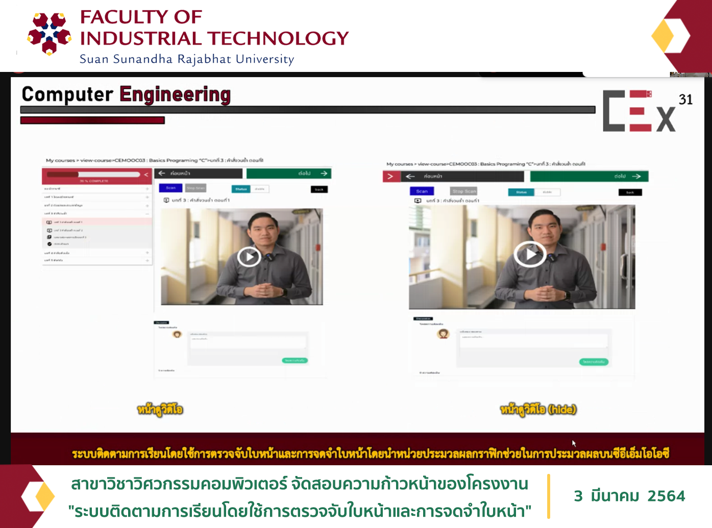 วันที่ 3 มีนาคม 2564 สาขาวิชาวิศวกรรมคอมพิวเตอร์ จัดสอบความก้าวหน้าของโครงงานวิศวกรรมคอมพิวเตอร์ 2 กลุ่ม นายกานต์ ดำประภา นายทวีศักดิ์ นวนจำปา และกษิดิส สอนรอด ในหัวข้อเรื่อง"ระบบติดตามการเรียนโดยใช้การตรวจจับใบหน้าและการจดจำใบหน้าโดยนำหน่วยประมวลผลกราฟิกช่วยในการประมวลผล" โดยมี ผศ.อภิสิทธิ์ รัตนาตรานุรักษ์ เป็นอาจารย์ที่ปรึกษา และมีอาจารย์ในสาขาวิชาฯ เป็นคณะกรรมการในการสอบ ผ่านแอปพลิเคชัน Google Meet