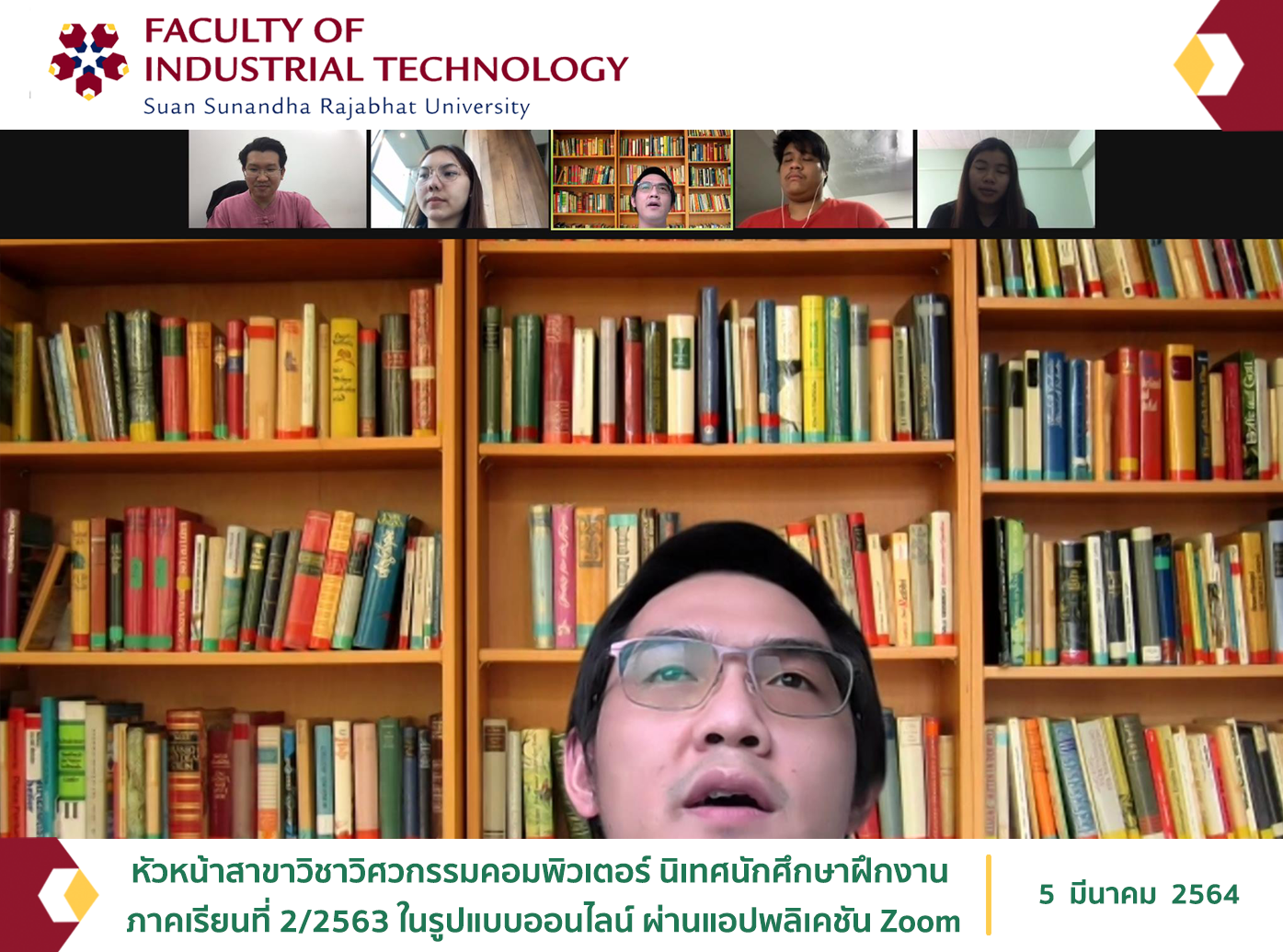 5 มีนาคม 2564 อาจารย์ ดร.เศรษฐกาล โปร่งนุช หัวหน้าสาขาวิชาวิศวกรรมคอมพิวเตอร์ นิเทศนักศึกษาฝึกงาน ประจำภาคเรียนที่ 2/2563 ในรูปแบบออนไลน์ ผ่านแอปพลิเคชัน Zoom โดยมีนางสาววริษา กองไชย นายวิศรุต วิทยา และนางสาวมัทธนา มาตย์วงศ์ ฝักงานที่บริษัท Handywings Co.,Ltd. ตำบลบางกรวย อำเภอบางกรวย จ.นนทบุรี