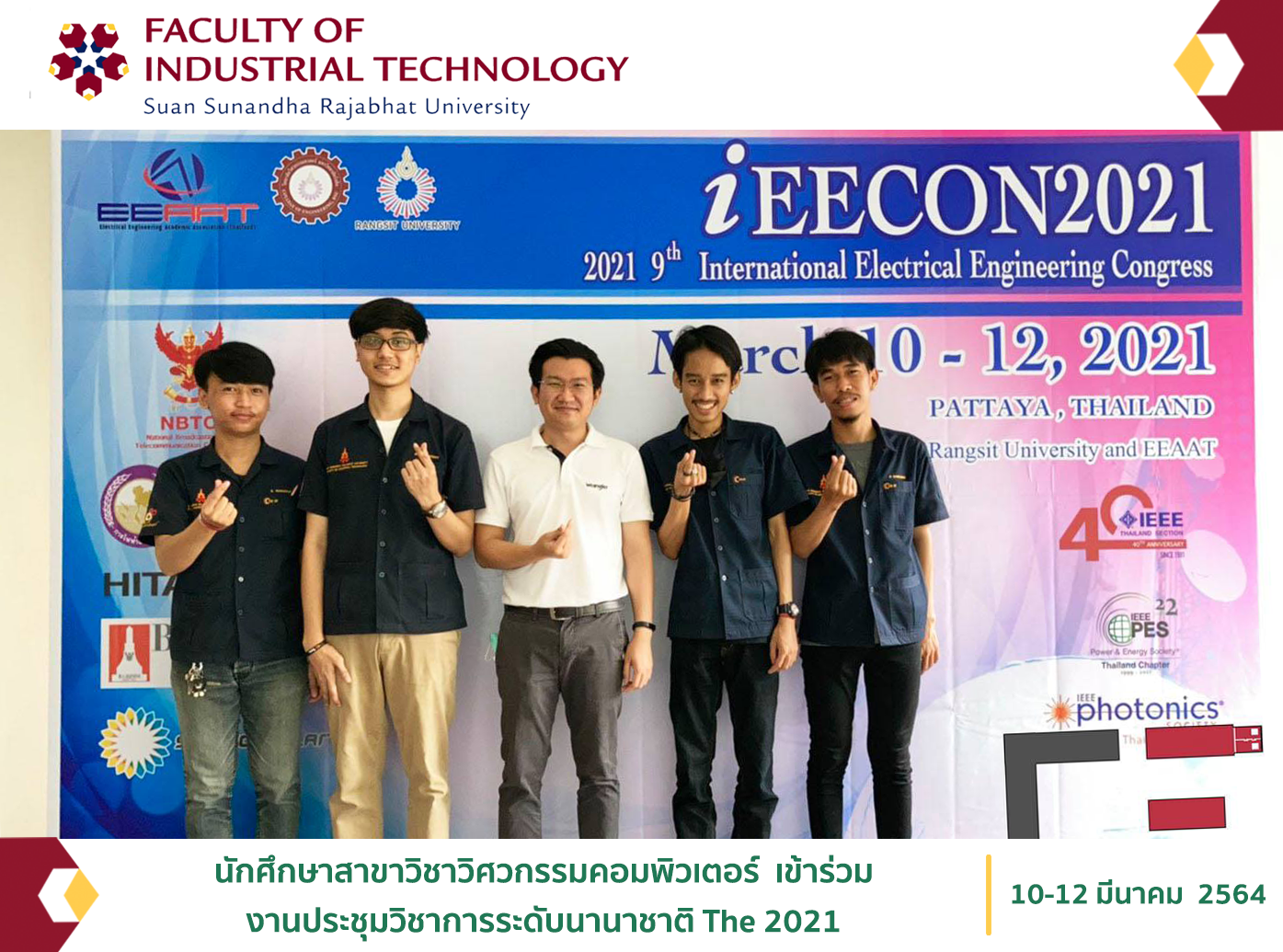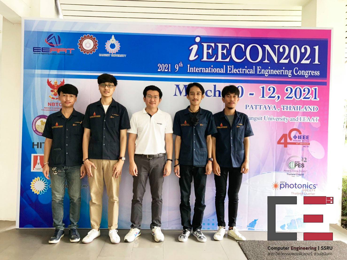 วันที่ 10-12 มีนาคม 2564 อาจารย์ ดร.เศรษฐกาล โปร่งนุช หัวหน้าสาขาวิชาวิศวกรรมคอมพิวเตอร์ พร้อมด้วยนายศรัณย์ กงมะณี นายณัฐวัตร บุณยธรรมิก นายศักรินทร์ เพ็งแจ่ม และนายวราวุธ สุริวงค์ นักศึกษาสาขาวิชาวิศวกรรมคอมพิวเตอร์ เข้าร่วมงานประชุมวิชาการระดับนานาชาติ The 2021 International Electrical Engineering Congress (#iEECON2021) ณ โรงแรม Pullman Pattaya Hotel G พัทยา จ.ชลบุรี จัดโดยมหาวิทยาลัยรังสิต และสมาคม EEAAT (Electrical Engineering Academic Association Thailand) มี Dr. Pakorn Apaphant จาก GISTDA และ Pongsakorn Yuthagovit จาก PEA เป็น Keynote Speaker ให้ความรู้ในหัวข้อเรื่อง From space technology to spatial information และ Innovation Research and Development for Digital Utility in PEA