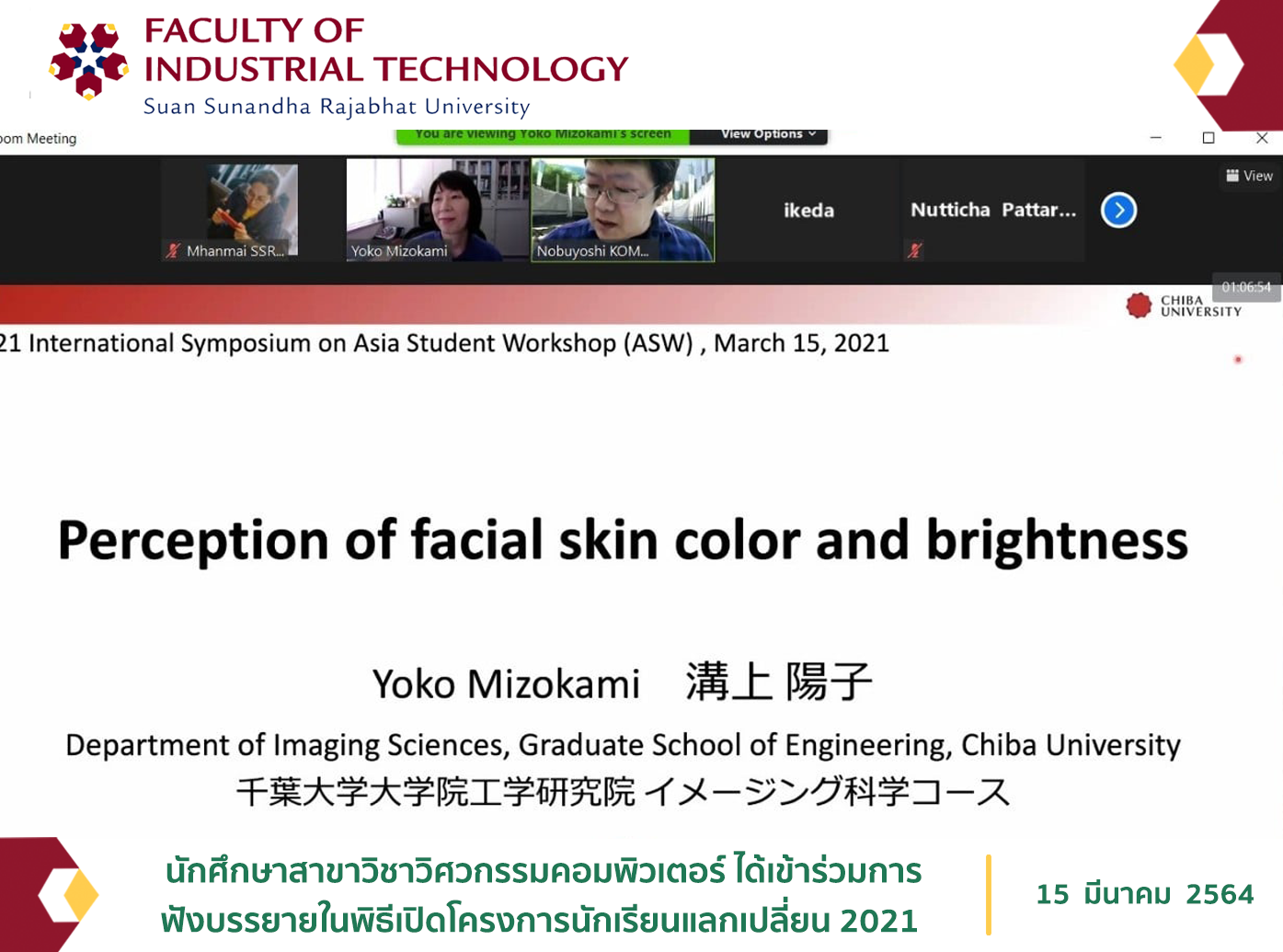 15 มีนาคม 2564 นางสาวม่านไหม ฐิติยากูร และนายคามิน แสงศรี นักศึกษาชั้นปีที่ 4 สาขาวิชาวิศวกรรมคอมพิวเตอร์ ได้เข้าร่วมการฟังบรรยายในพิธีเปิดโครงการนักเรียนแลกเปลี่ยน 2021 International Symposium on Asia Student Workshop (ASW) ออนไลน์ ผ่านแอปพลิเคชัน Zoom จัดขึ้นโดย Chiba University ประเทศญี่ปุ่น ซึ่งมีการบรรยายโดยศาสตราจารย์ จากมหาวิทยาลัยต่างๆ ในหัวข้อเรื่องที่เกี่ยวข้องกับ Machine Learning และ Image Processing