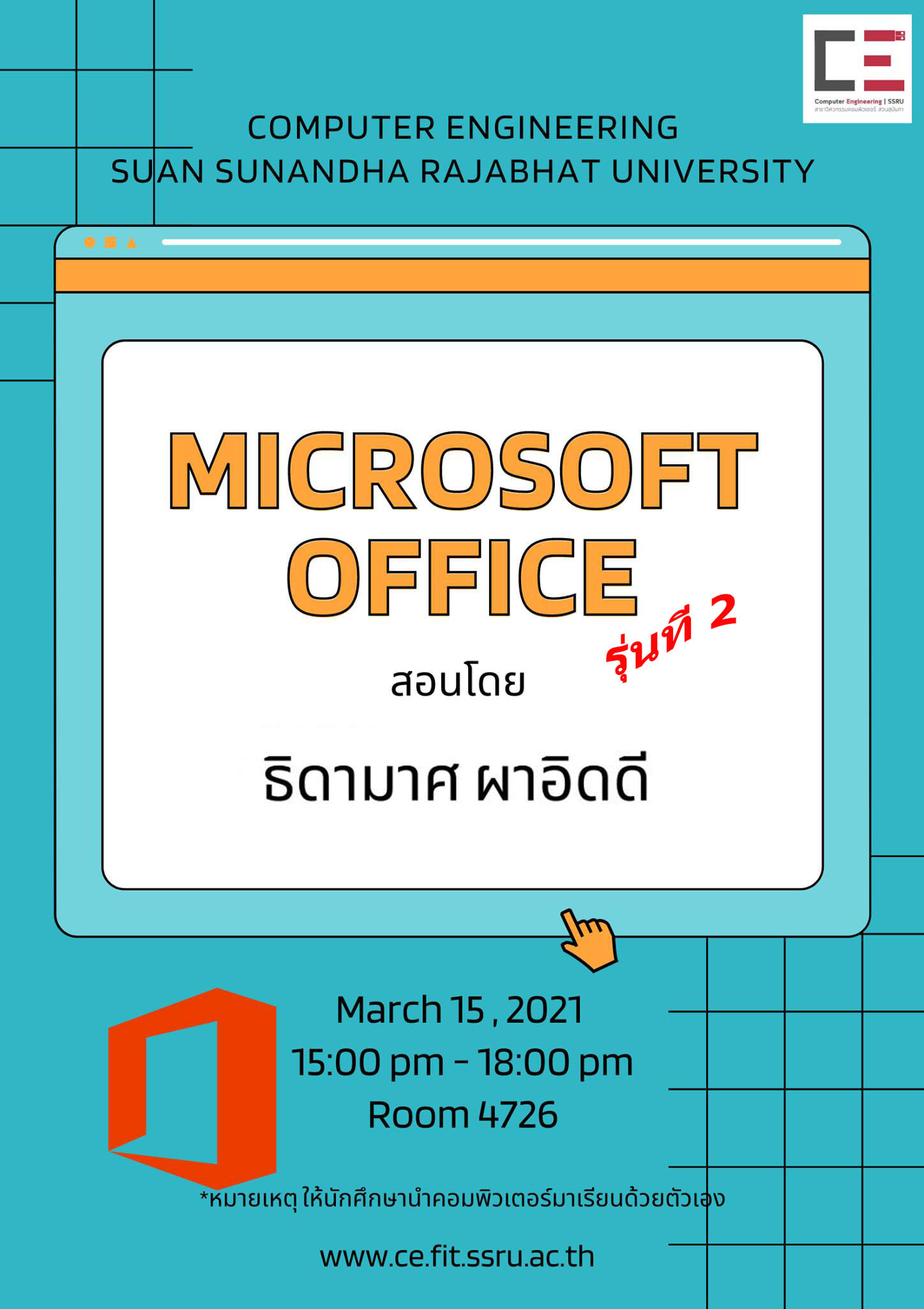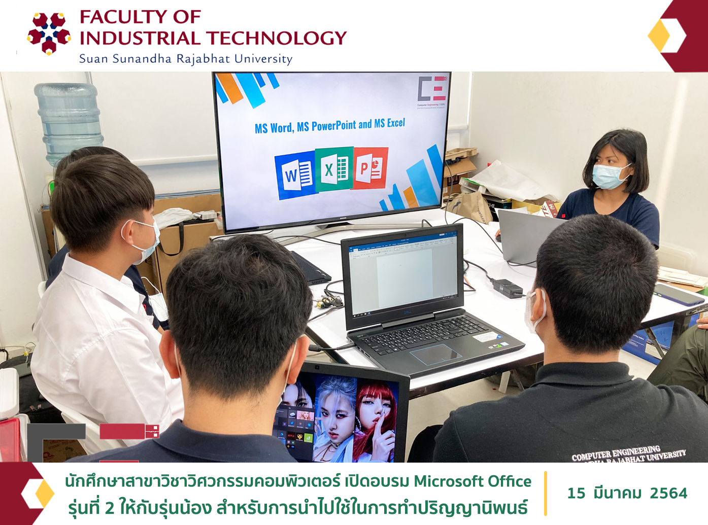 วันจันทร์ที่ 15 มีนาคม 2564 นางสาวธิดามาศ ผาอิดดี นักศึกษาสาขาวิชาวิศวกรรมคอมพิวเตอร์ เปิดอบรม Microsoft Office รุ่นที่ 2 ให้กับรุ่นน้องๆ นักศึกษาสาขาวิชาวิศวกรรมคอมพิวเตอร์ที่มีความสนใจ สำหรับการนำไปใช้ในการทำปริญญานิพนธ์ และการนำเสนอผลงานให้มีความเป็นมืออาชีพมากยิ่งขึ้น ซึ่งมีนักศึกษาสาขาวิชาวิศวกรรมคอมพิวเตอร์สนใจเข้าร่วมอบรมเป็นจำนวนมาก ณ ห้อง 4726 อาคาร 47 คณะเทคโนโลยีอุตสาหกรรม มหาวิทยาลัยราชภัฏสวนสุนันทา