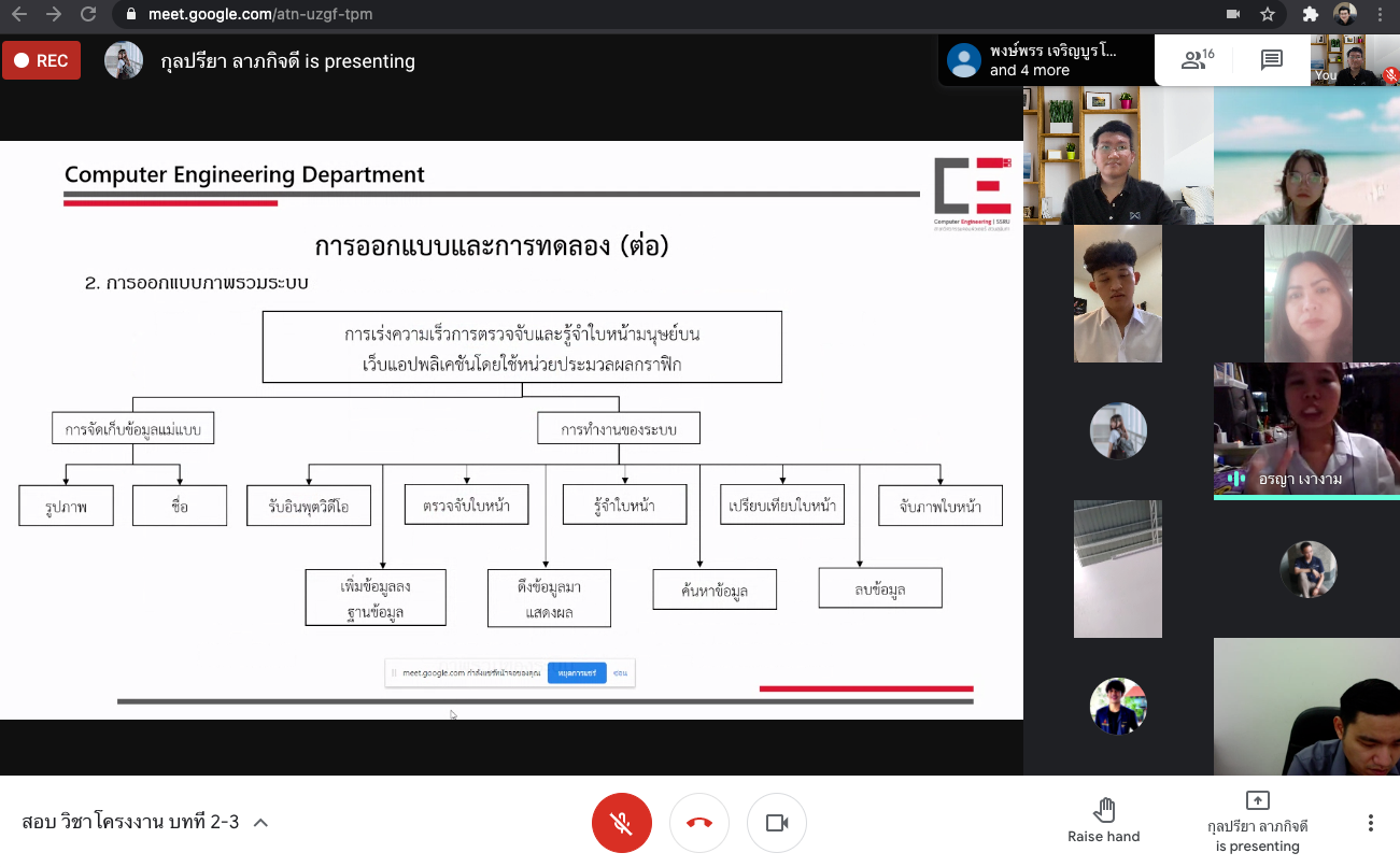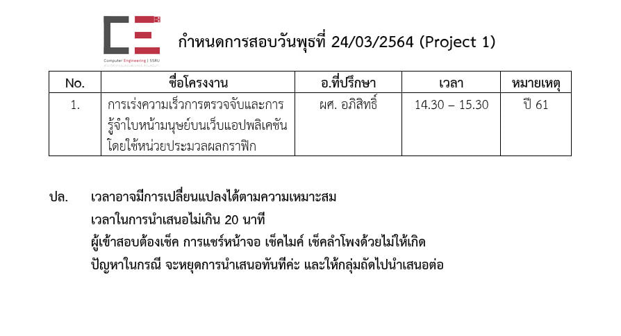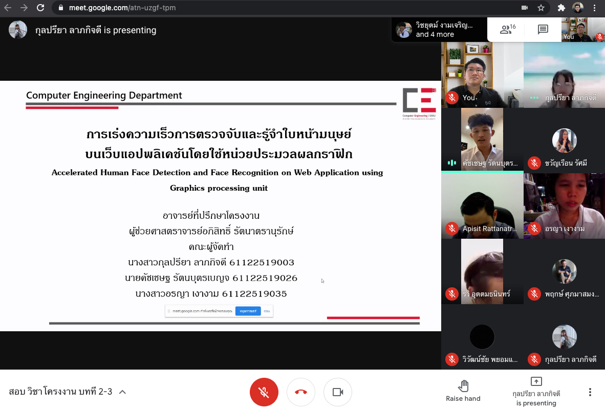 ในหัวข้อเรื่อง"การเร่งความเร็วการตรวจจับและรู้จำใบหน้ามนุษย์บนเว็บแอปพลิเคชันโดยใช้หน่วยประมวลผลกราฟิก" คณะผู้จัดทำ ได้แก่ นางสาวกุลปรียา ลาภกิจดี นายคัชเชษฐ รัตนบุตรเบญจ และนางสาวอรญา เงางาม โดยมี ผศ.อภิสิทธิ์ รัตนาตรานุรักษ์ เป็นอาจารย์ที่ปรึกษา และมีอาจารย์ในสาขาวิชาฯ เป็นคณะกรรมการในการสอบ ผ่านแอปพลิเคชัน Google Meet