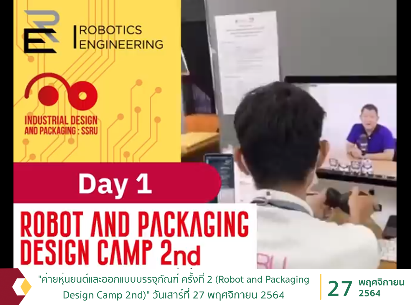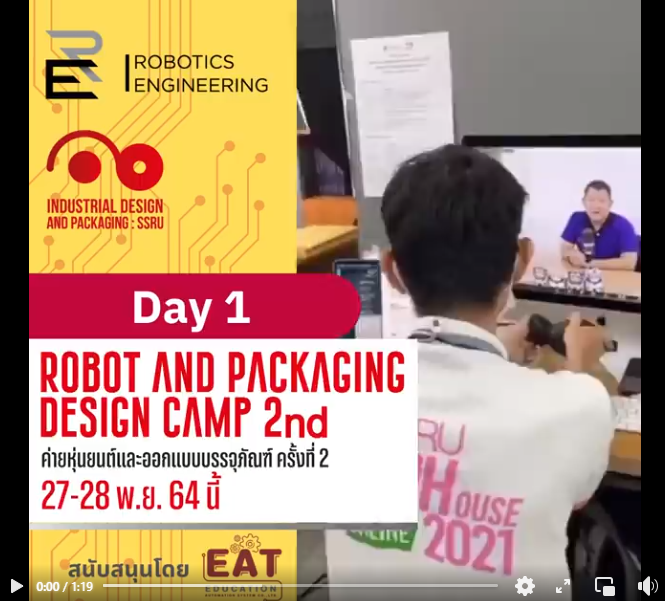 "ค่ายหุ่นยนต์และออกแบบบรรจุภัณฑ์ ครั้งที่ 2 (Robot and Packaging Design Camp 2nd)" วันเสาร์ที่ 27 พฤศจิกายน 2564 รูปแบบออนไลน์ (Online) จัดโดยสาขาวิชาวิศกรรมหุ่นยนต์ และสาขาวิชาการออกแบบผลิตภัณฑ์และบรรจุภัณฑ์ คณะเทคโนโลยีอุตสาหกรรม มหาวิทยาลัยราชภัฏสวนสุนันทา