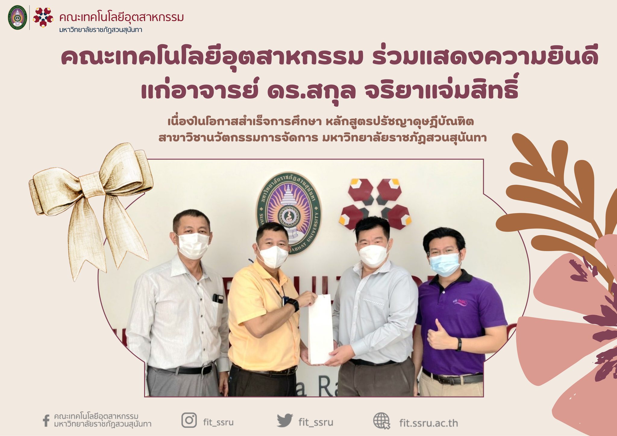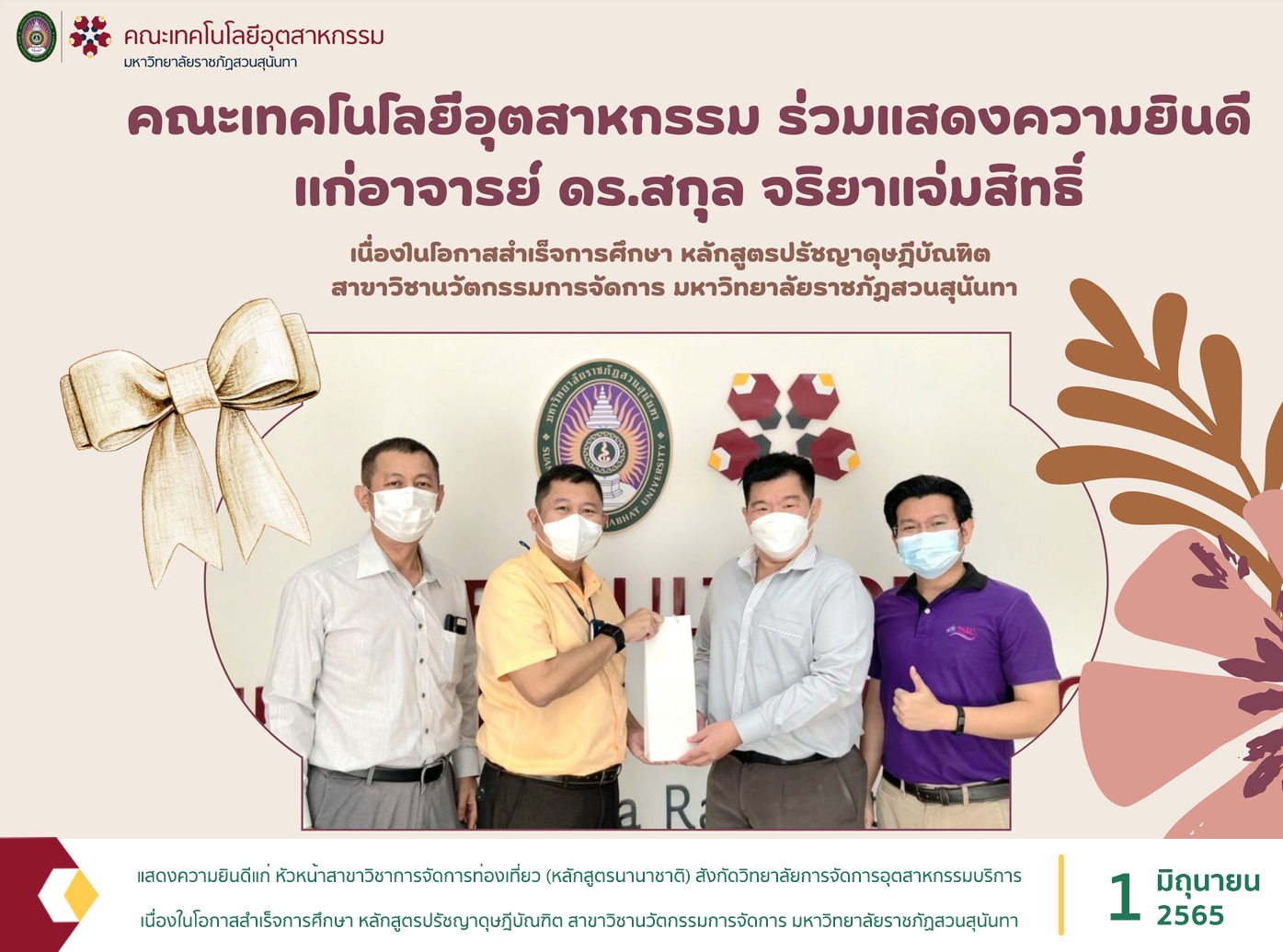 วันที่ 1 มิถุนายน พ.ศ. 2565 นำโดย ผู้ช่วยศาสตราจารย์ ดร.สุรพันธุ์ รัตนาวะดี คณบดีคณะเทคโนโลยีอุตสาหกรรม พร้อมด้วยอาจารย์ ดร.ธงชัย ทองมารองคณบดีฝ่ายบริหาร และผู้ช่วยศาสตราจารย์ ดร.เศรษฐกาล โปร่งนุช หัวหน้าสาขาวิชาวิศวกรรมหุ่นยนต์มอบของขวัญแสดงความยินดีแก่ อาจารย์ ดร.สกุล จริยาแจ่มสิทธิ์ หัวหน้าสาขาวิชาการจัดการท่องเที่ยว (หลักสูตรนานาชาติ) สังกัดวิทยาลัยการจัดการอุตสาหกรรมบริการ เนื่องในโอกาสสำเร็จการศึกษา หลักสูตรปรัชญาดุษฎีบัณฑิต สาขาวิชานวัตกรรมการจัดการ มหาวิทยาลัยราชภัฏสวนสุนันทา