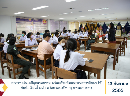 วันที่ 13 กันยายน 2565 คณะเทคโนโลยีอุตสาหกรรม นำโดย คุณบัญนษร สันฐาน หัวหน้าฝ่ายบริการการศึกษา พร้อมด้วยทีมแนะแนวการศึกษา ได้เข้าแนะแนวการศึกษาประจำปีการศึกษา 2566 ให้กับนักเรียนโรงเรียนวัดนวลนรดิศ จ.กรุงเทพมหานคร เพื่อเป็นแนวทางในการศึกษาต่อคณะเทคโนโลยีอุตสาหกรรม มหาวิทยาลัยราชภัฏสวนสุนันทา