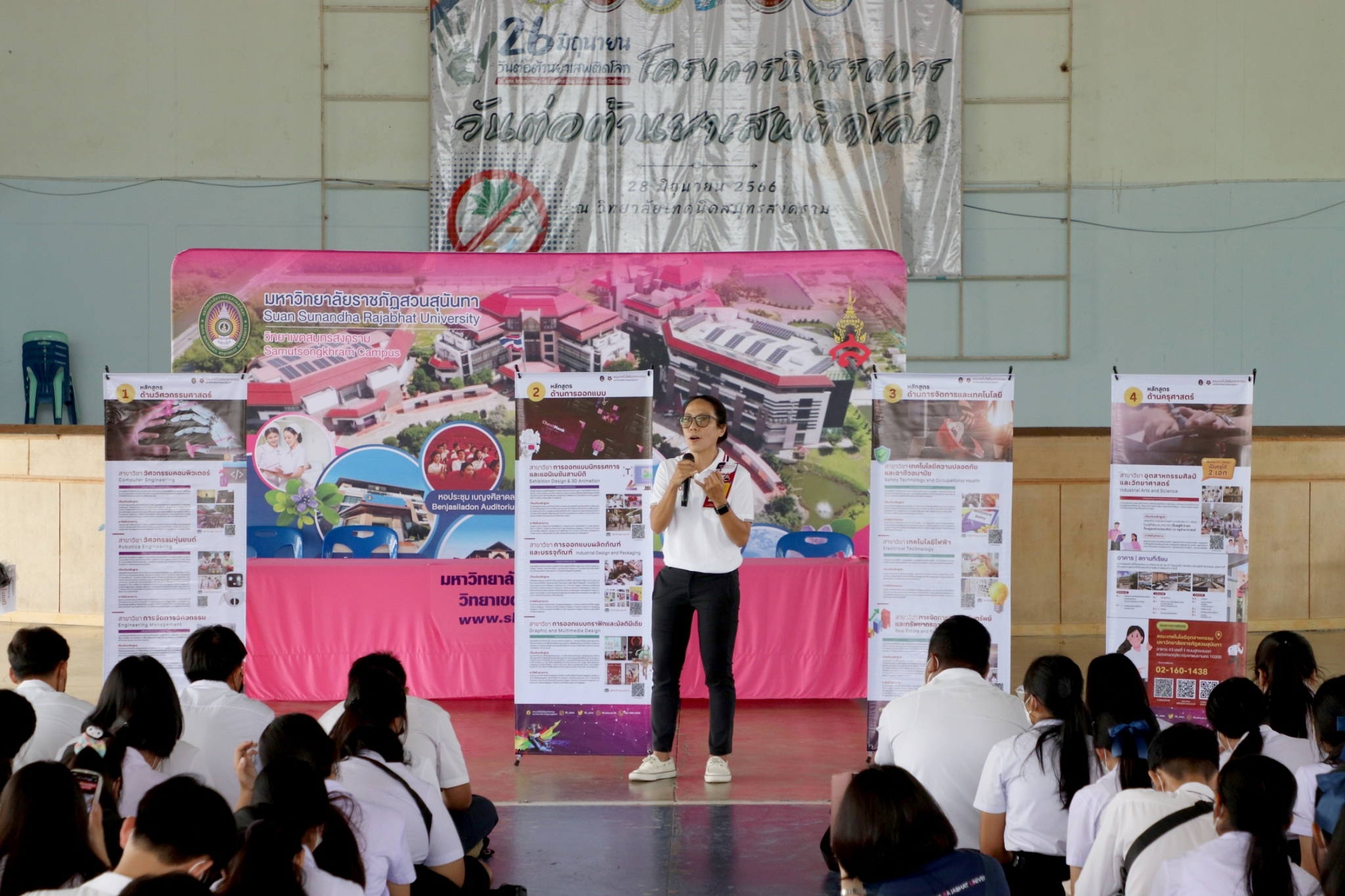 วันที่ 19 กรกฎาคม 2566 ดร.ธุวธิดา สุวรรณรัตน์ ผู้ช่วยอธิการบดีฝ่ายสื่อสารองค์กร มหาวิทยาลัยราชภัฏสวนสุนันทา พร้อมด้วยรองคณบดี และคณาจารย์ คณะเทคโนโลยีอุตสาหกรรม เข้าประชาสัมพันธ์การรับนักศึกษาประจำปีการศึกษา 2567 ให้กับนักเรียนวิทยาลัยเทคนิคสมุทรสงคราม ทั้งนี้ได้รับเกียรติจากคุณสุรินทร์ ตำลิ่ม ผู้อำนวยการวิทยาลัยเทคนิคสมุทรสงคราม คณะครู ให้การต้อนรับ ซึ่งมีนักเรียนให้ความสนใจกว่า 500 คน