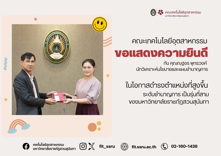 คณะเทคโนโลยีอุตสาหกรรม นำโดย ผู้ช่วยศาสตราจารย์ ดร. ชนมภัทร โตระสะ คณบดี ขอแสดงความยินดี กับ คุณณฐอร พุทธวงค์ นักวิเคราะห์นโยบายและแผนชำนาญการ ในโอกาสดำรงตำแหน่งที่สูงขึ้น ระดับชำนาญการ เป็นรุ่นที่สามของมหาวิทยาลัยราชภัฏสวนสุนันทา