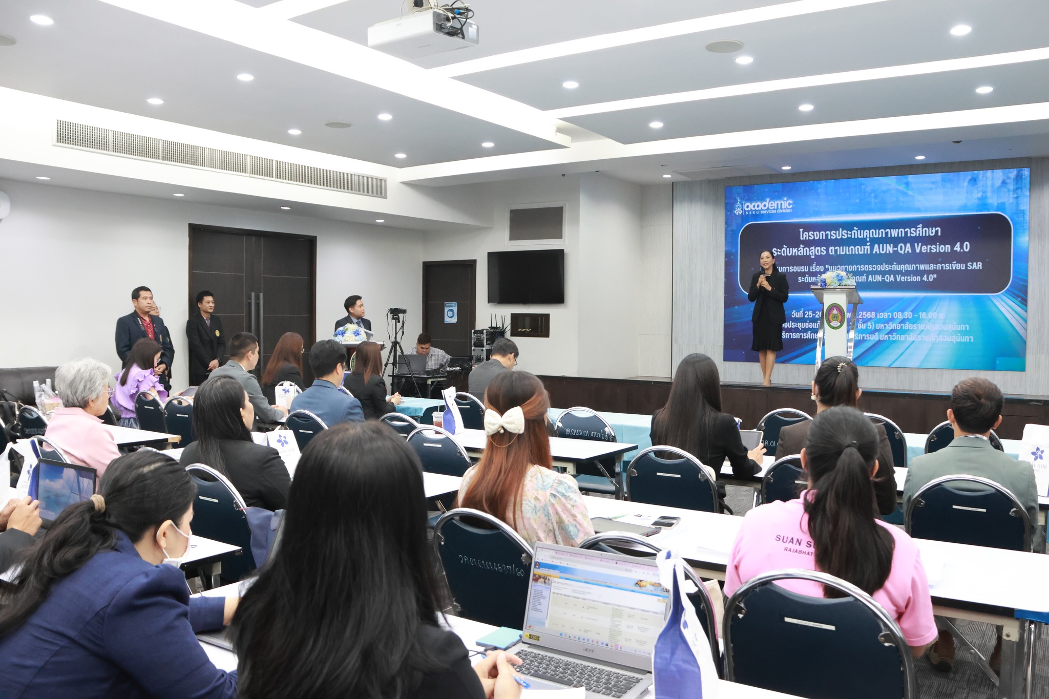 เมื่อวันวันที่ 25 มีนาคม 2568 ผู้ช่วยศาสตราจารย์ ดร.ชนมภัทร โตระสะ คณบดีคณะวิศวกรรมศาสตร์และเทคโนโลยีอุตสาหกรรม พร้อมด้วยอาจารย์ ดร.ธงชัย ทองมา รองคณบดีฝ่ายบริหารและประกันคุณภาพ และผู้ช่วยศาสตราจารย์ ดร.ปรีชญา ครูเกษตร รองคณบดีฝ่ายวิชาการและแผนงาน เข้าร่วมโครงการประกันคุณภาพการศึกษาระดับหลักสูตร ตามเกณฑ์ AUN-QA Version 4.0 ในหัวข้อ "แนวทางการตรวจประกันคุณภาพและการเขียน SAR ระดับหลักสูตร ตามเกณฑ์ AUN-QA Version 4.0" โดยมี รองศาสตราจารย์ ดร.ชุติกาญจน์ ศรีวิบูลย์ อธิการบดีมหาวิทยาลัยราชภัฏสวนสุนันทา เป็นประธานกล่าวเปิดโครงการ และได้รับเกียรติจาก รองศาสตราจารย์ ดร.อำพล นววงศ์เสถียร คณบดีคณะบัญชีและวิทยาการจัดการ มหาวิทยาลัยเซาร์อีสท์บางกอก เป็นวิทยากรให้ความรู้ในการเตรียมพร้อมรับการตรวจประกันคุณภาพการศึกษาแบบ AUN-QA Version 4.0 ณ ห้องประชุมช่อแก้ว อาคาร 31 ชั้น 5 มหาวิทยาลัยราชภัฏสวนสุนันทา โดยโครงการจัดขึ้นระหว่างวันที่ 25 – 26 มีนาคม 2568 การจัดอบรมในวันแรกนั้น เป็นการรับฟังบรรยาย “แนวทางการประกันคุณภาพการศึกษา ระดับหลักสูตร ตามเกณฑ์ AUN-QA Version 4.0"