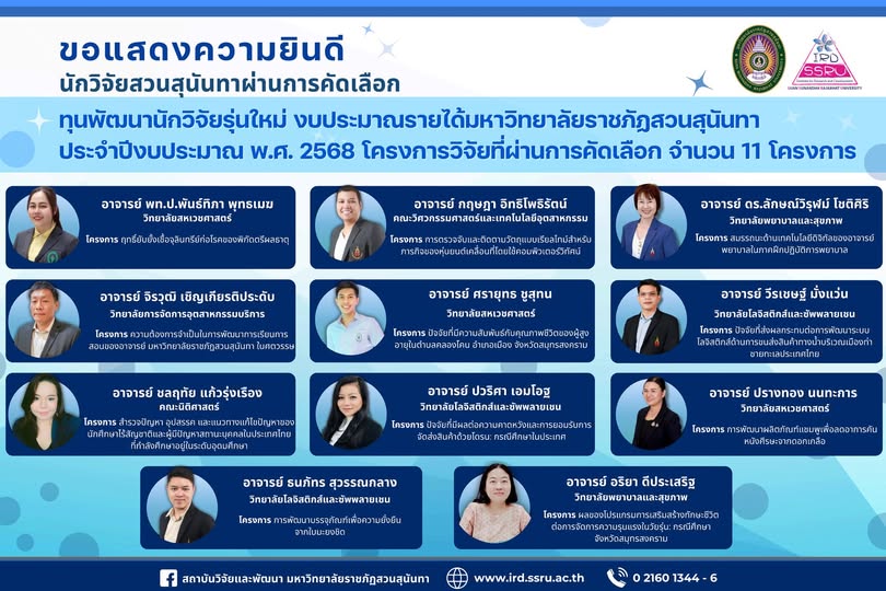 คณะวิศวกรรมศาสตร์และเทคโนโลยีอุตสาหกรรม ขอแสดงความยินดีกับ อาจารย์กฤษฎา อิทธิโพธิรัตน์ อาจารย์ประจำสาขาวิชาวิศวกรรมหุ่นยนต์ ที่ได้รับทุนพัฒนานักวิจัยรุ่นใหม่ ประจำปีงบประมาณ พ.ศ. 2568 จากสถาบันวิจัยและพัฒนา มหาวิทยาลัยราชภัฏสวนสุนันทา โครงการวิจัย เรื่อง การตรวจจับและติดตามวัตถุแบบเรียลไทม์สำหรับภารกิจของหุ่นยนต์เคลื่อนที่โดยใช้คอมพิวเตอร์วิทัศน์